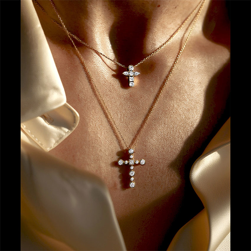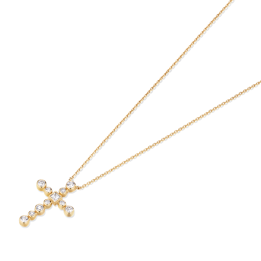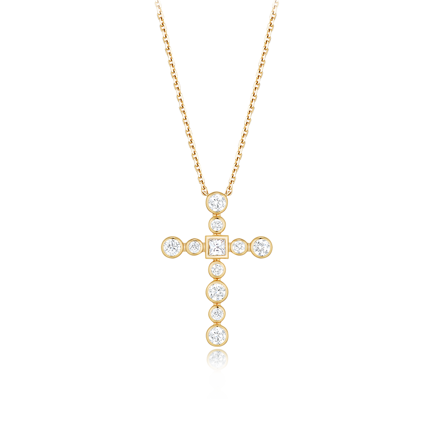 [Bezel Grande Cross Necklace] 라운드와 스퀘어 컷이 조화를 이루는 디자인으로, 중앙의 프린세스 컷이 포인트가 되어 디아모모 특유의 세련된 아이덴티티를 완성한 클래식 크로스 네크리스.